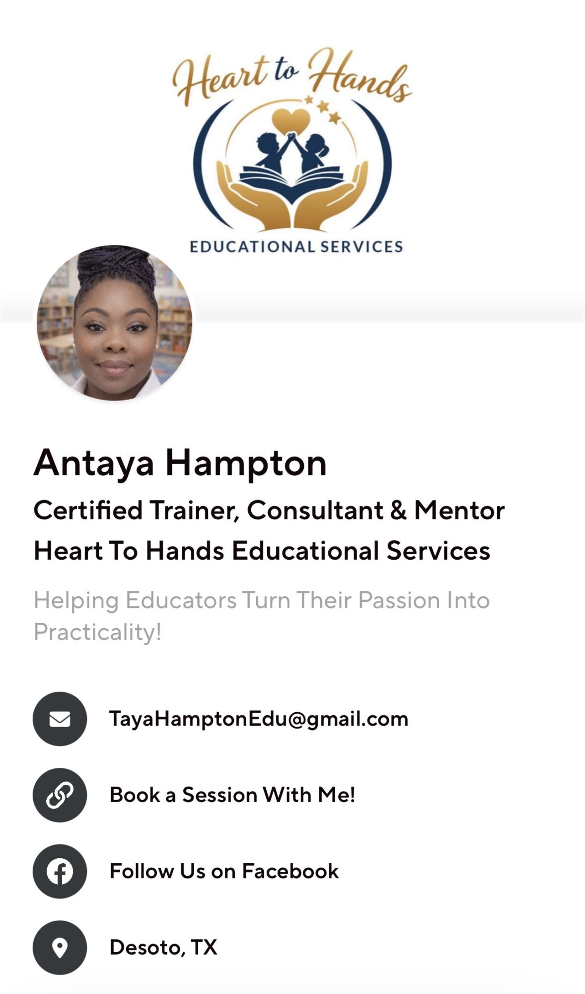 Heart to Hands is my other baby—this is where I empower other educators, child care owners, and aspiring providers to take what’s in their heart and bring it to life in their work. Whether it’s coaching, training, or helping someone launch or elevate their own child care business, I’m all about turning passion into purpose and practicality.