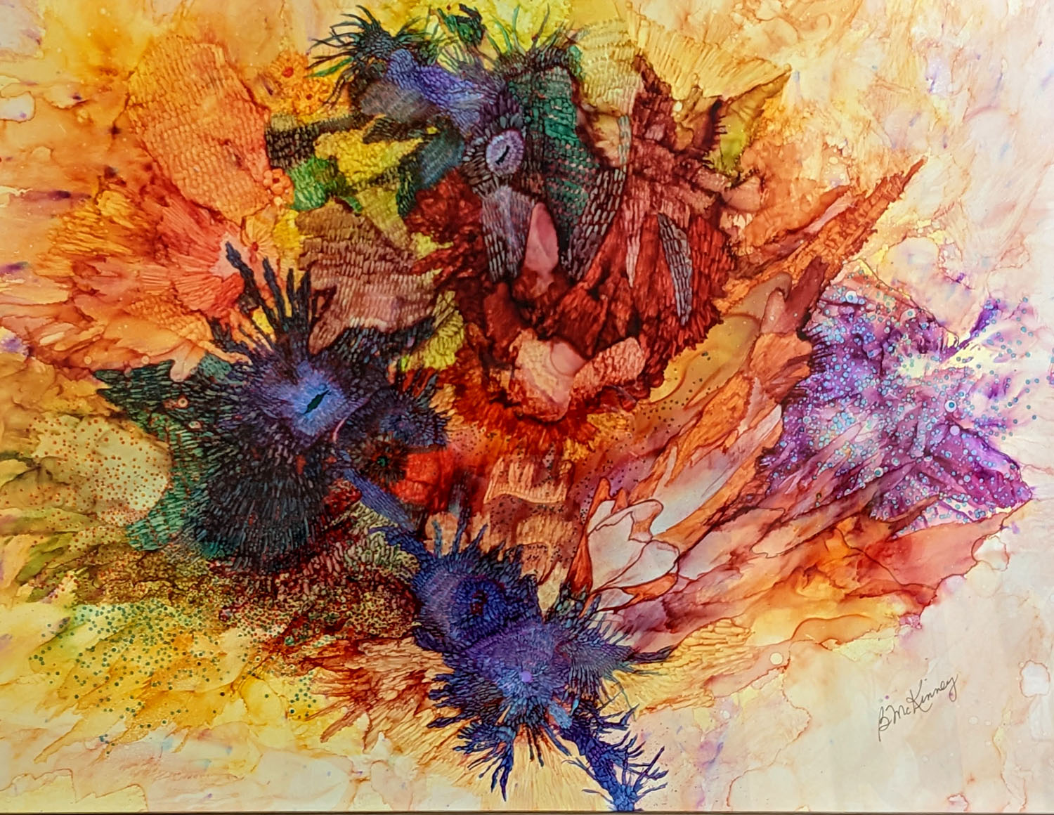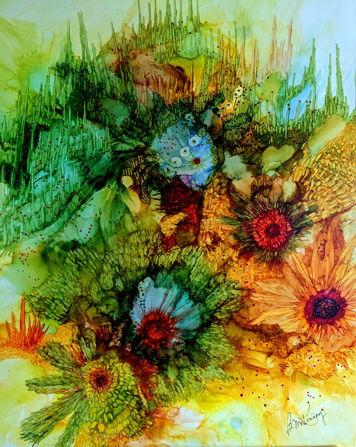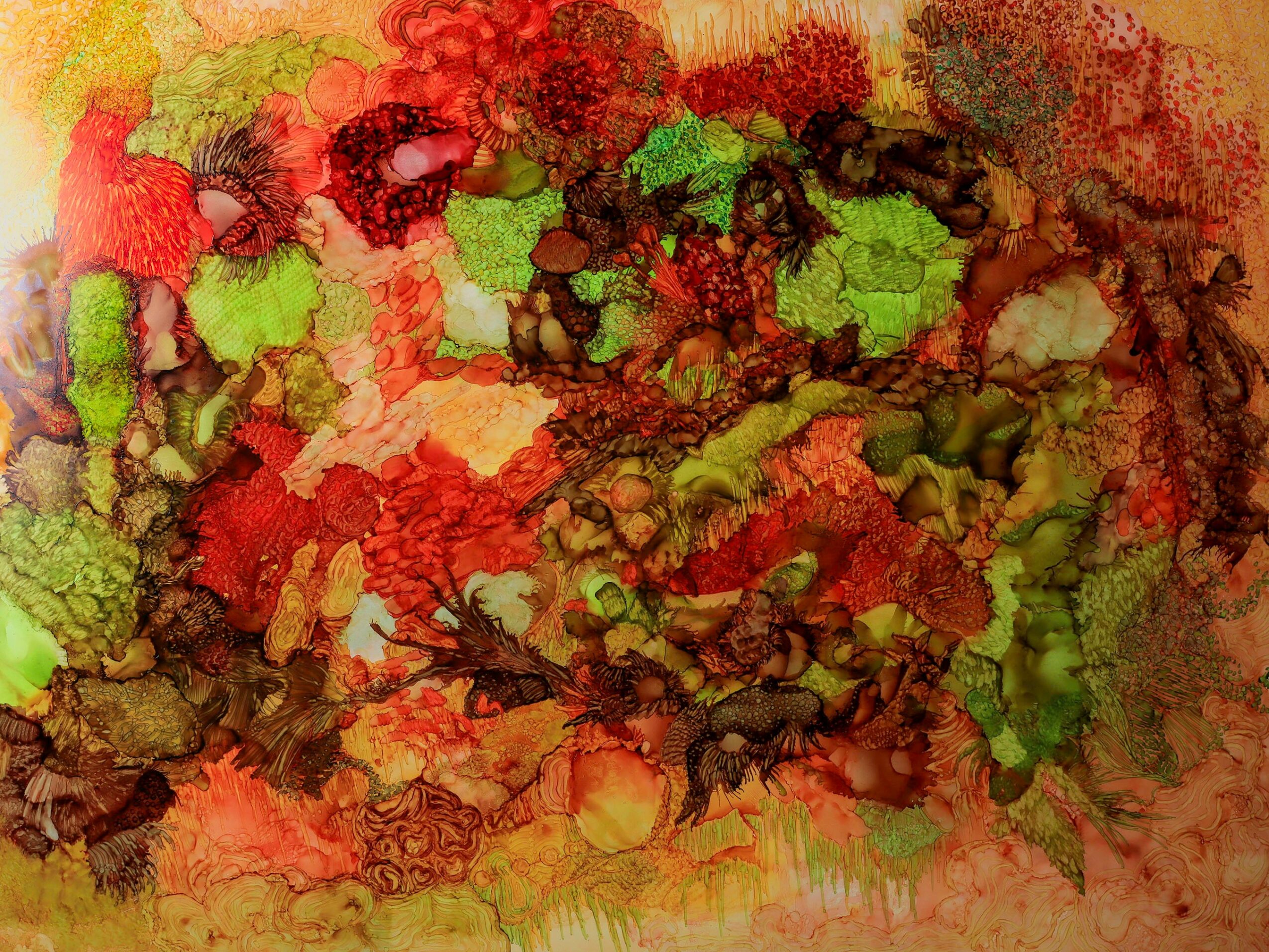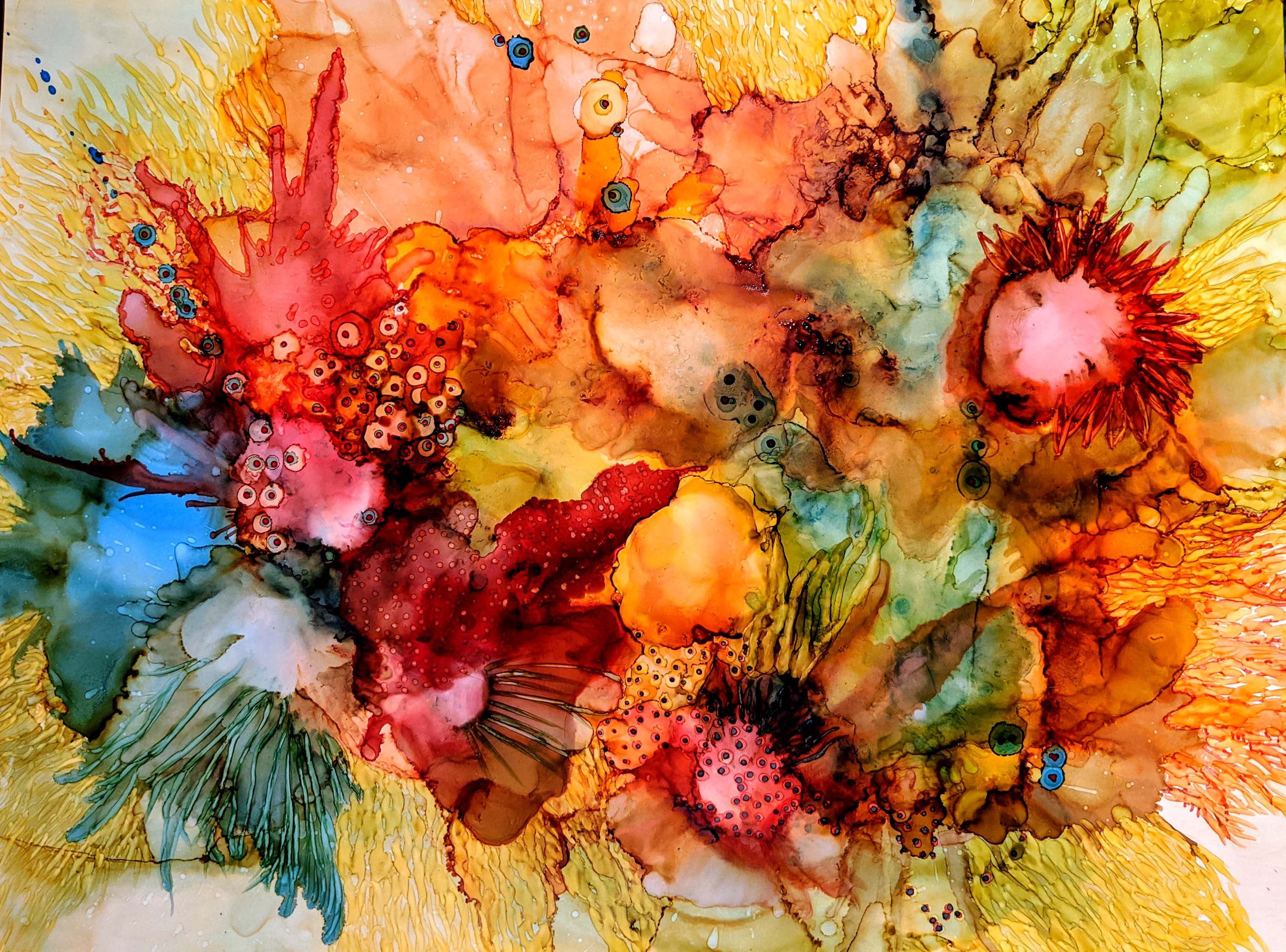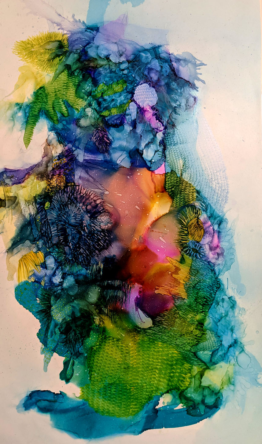Over the past five years, my work has evolved toward a more abstract and fluid approach through the use of alcohol ink on Yupo paper. While the materials and methods have shifted, my subject matter continues to be strongly influenced by nature.