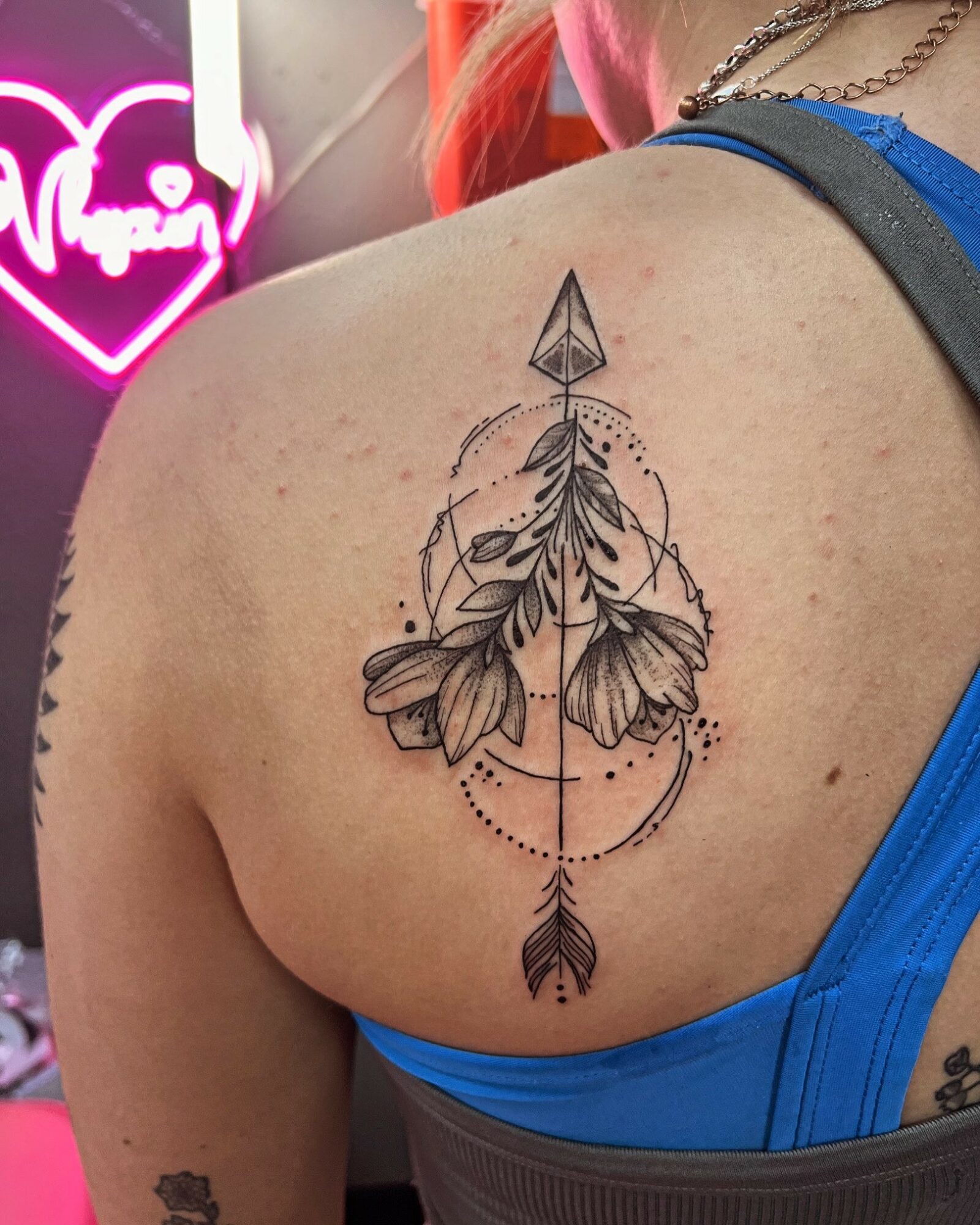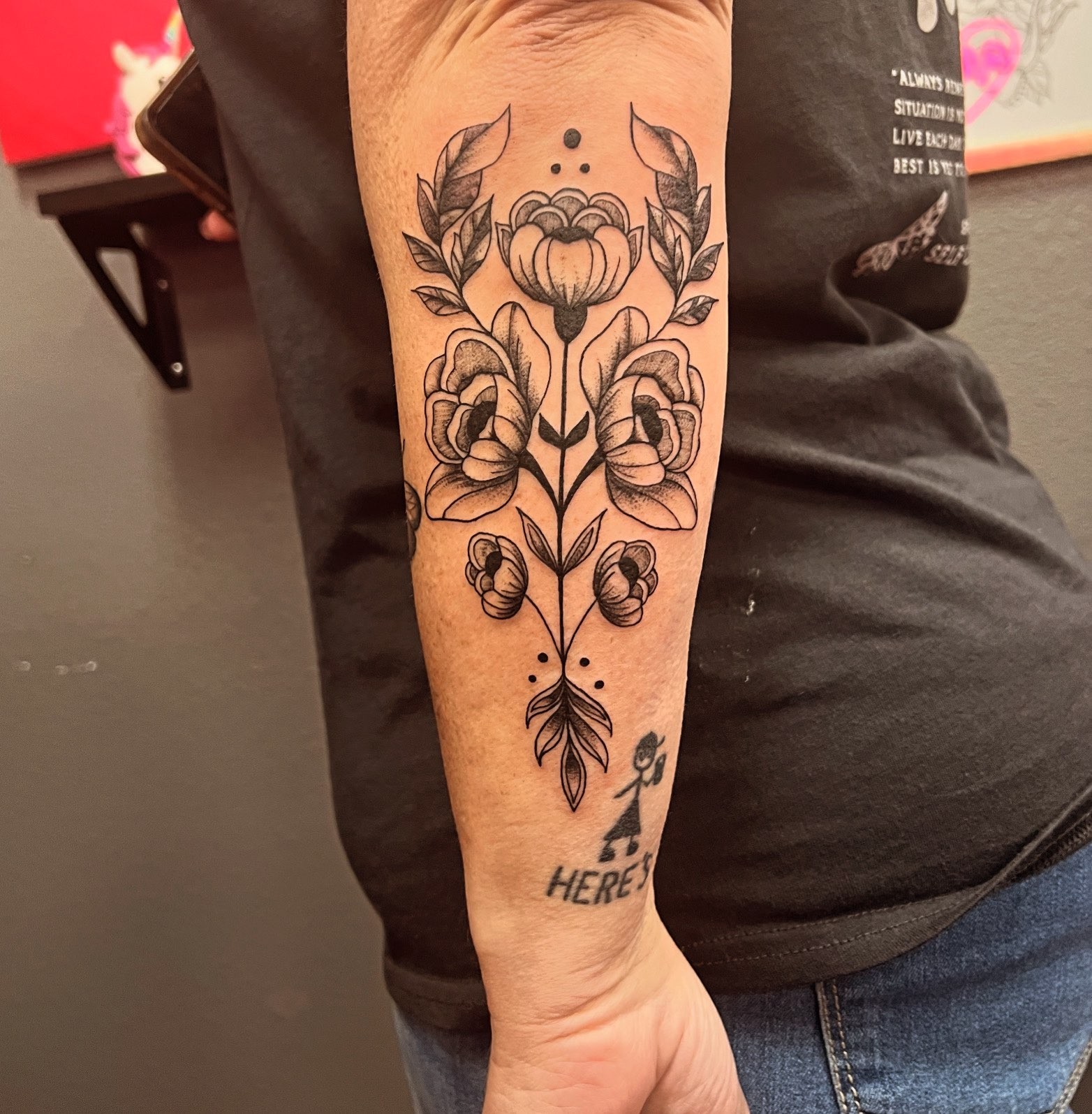 I am a tattoo artist! I absolutely adore my job, and I can’t see myself doing anything else. Above all other styles, I LOVE doing fine line and floral work. I love the simplicity and daintyness of these two styles, though I often do blackwork as well. Many people think that the simpler the tattoo is the easiest, but that’s usually not the case at all! Think about drawing a perfectly straight line… think about doing it with a marker, then think about doing it with a fine point pen… It’s NOT easy! Now, think bout doing it on a moving, breathing creature! It takes a lot of practice, patience, and discipline to achieve these crisp tiny lines on a living canvas, and I love the focus it takes to achieve them.