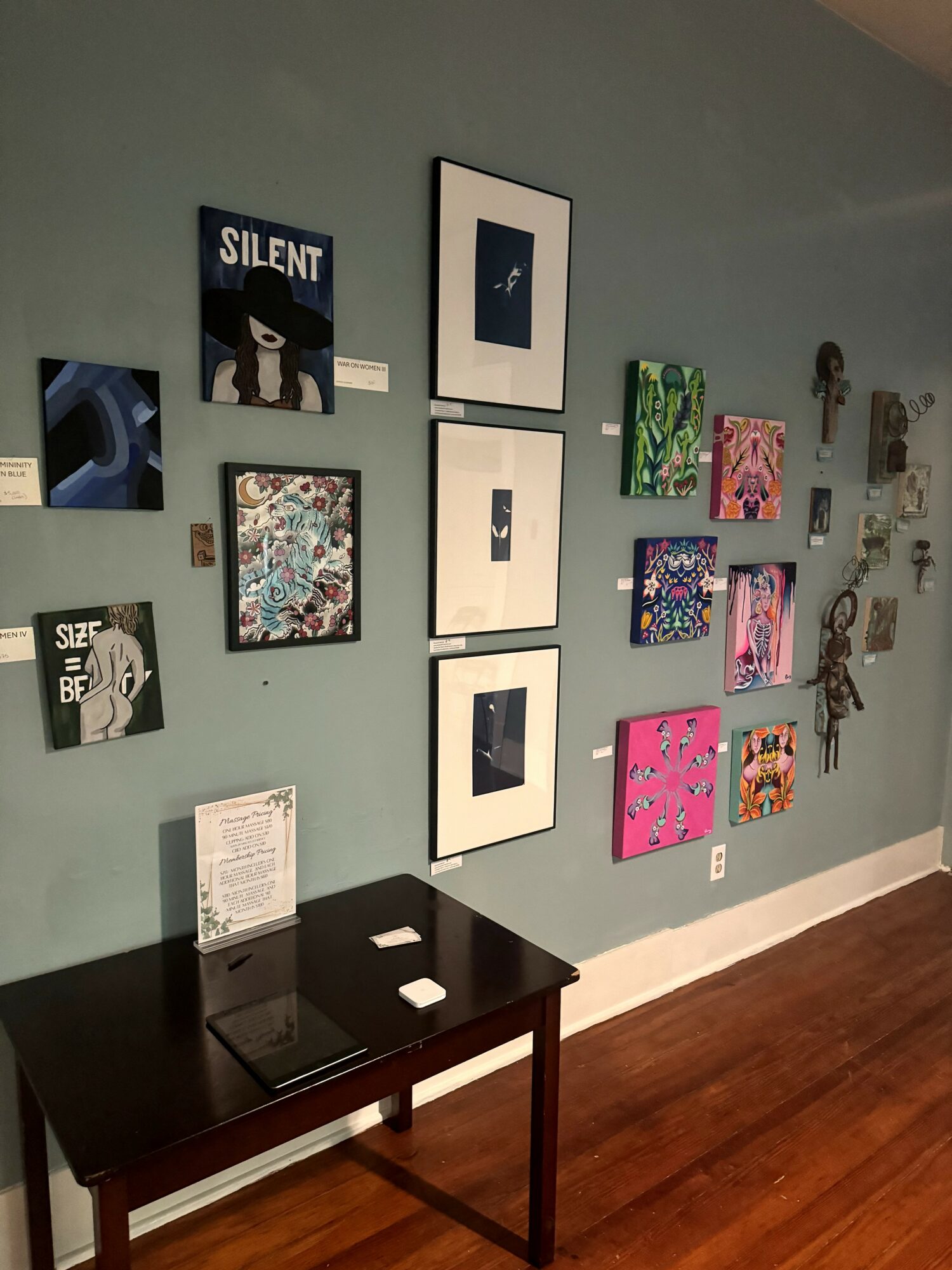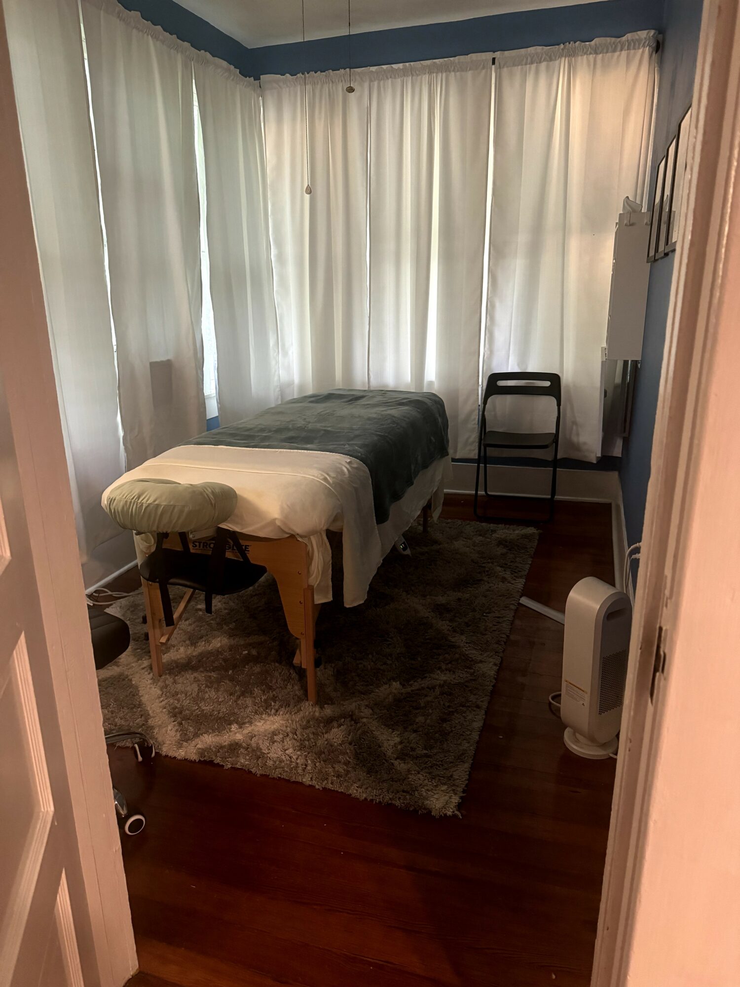 My main things I wanted to provide was not only tailored massages to every clients needs, but also an atmosphere of welcoming, community involvement and ethical membership plans. There is a community bulletin board featuring any local business that wants to, an art wall displaying art from local women artists available for sale, and most importantly- my memberships. Any member that needs to pause or cancel their membership will retain any credits they’ve accrued for as long as I am practicing. I do not believe in my clients paying for something and then having stipulations or time limits to use them. Another vital part of my plan is that I wanted to make sure massage was available to as many people as possible. I know I could charge much more, but massage is such an integral part of self care, I want to make it available to people who maybe can’t afford $100 for an hour massage.