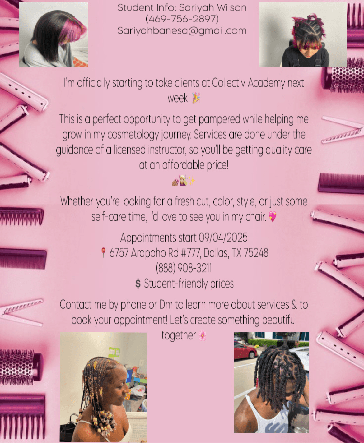 I’m a hairstylist and beauty creator with a focus on braiding, hair cuts , and creative color work. I’ve always loved transformation; taking something simple and turning it into something bold, unique, and full of personality. My clients know me for the attention I put into detail and for creating styles that make them feel confident and beautiful.