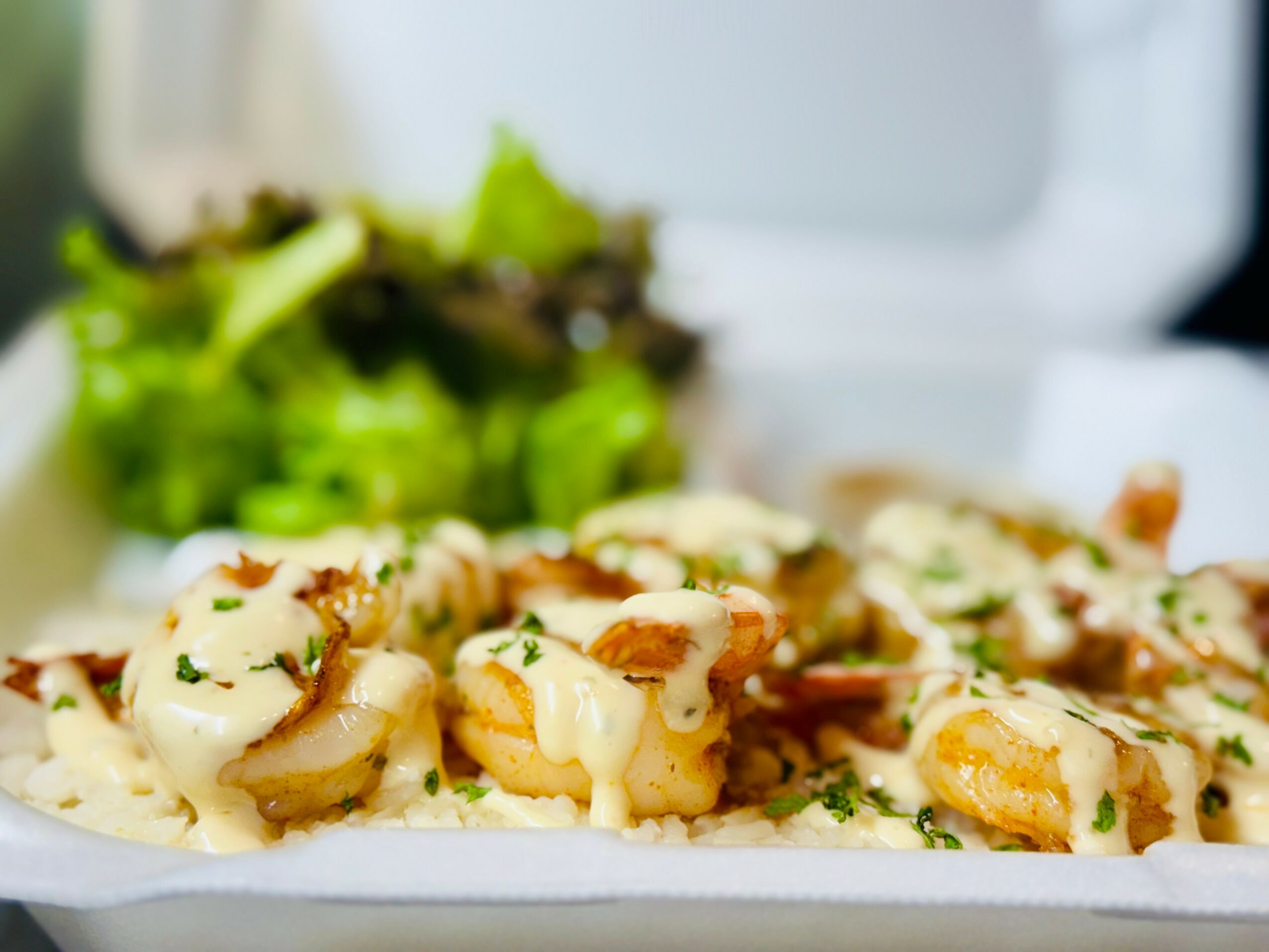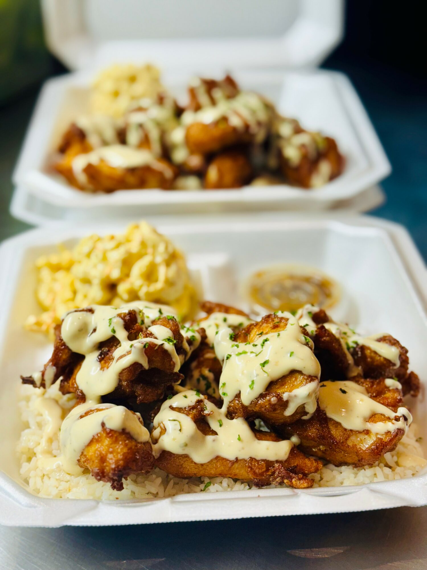 At Shane Boy’s Craft Hawaiian Grindz we’re best known for two signature dishes — our Firecracker Fried Chicken and our Creamy Garlic Butter Shrimp. The Firecracker Fried Chicken starts with our Hawaiian-style fried chicken, tossed in our house-made Firecracker sauce — sweet, spicy, and bold. The Garlic Butter Shrimp is a tribute to the famous shrimp trucks of the North Shore in Hawaii. It’s made with marinated, grilled shrimp finished in our fresh garlic butter sauce and topped with roasted garlic cream — rich, simple, and full of flavor.