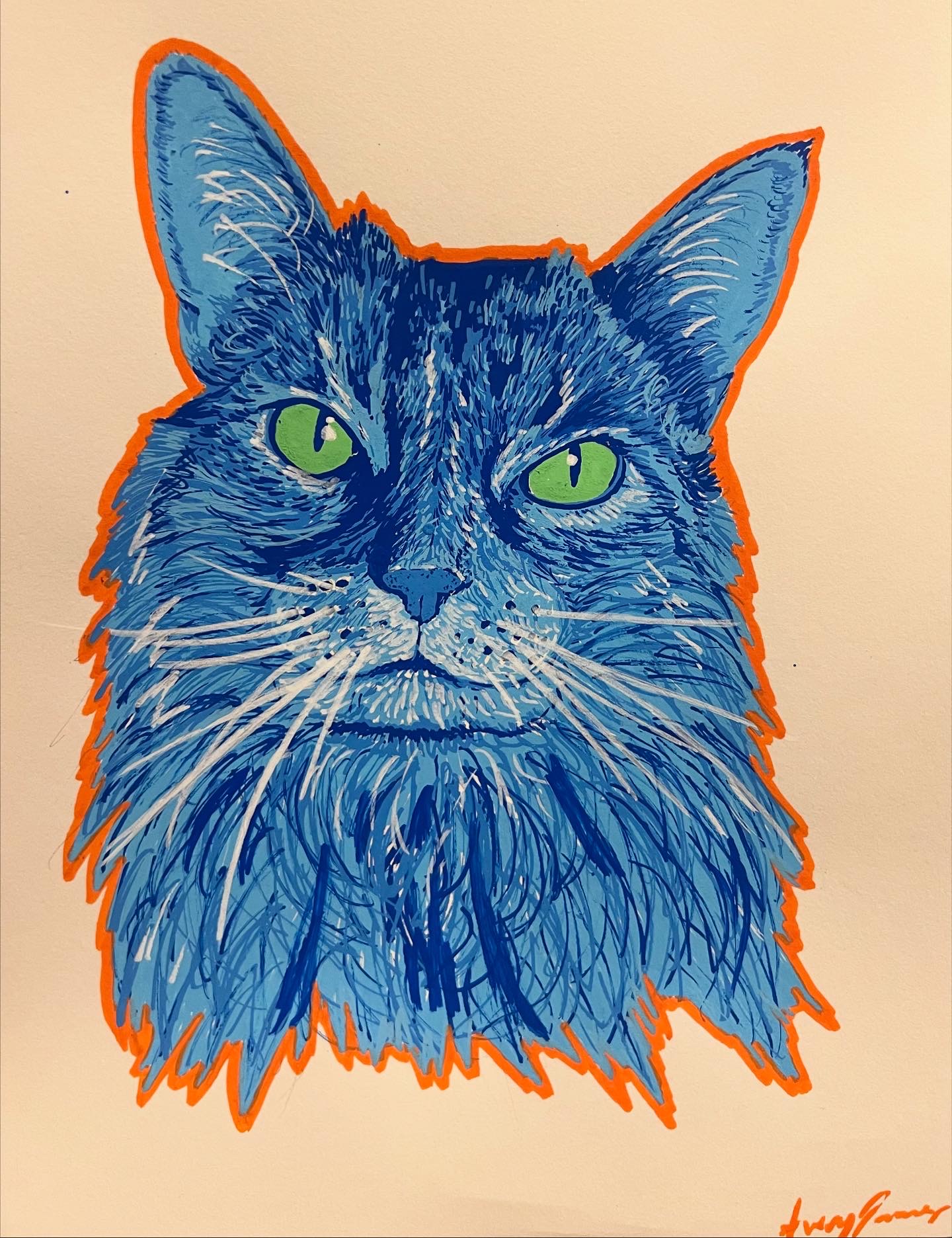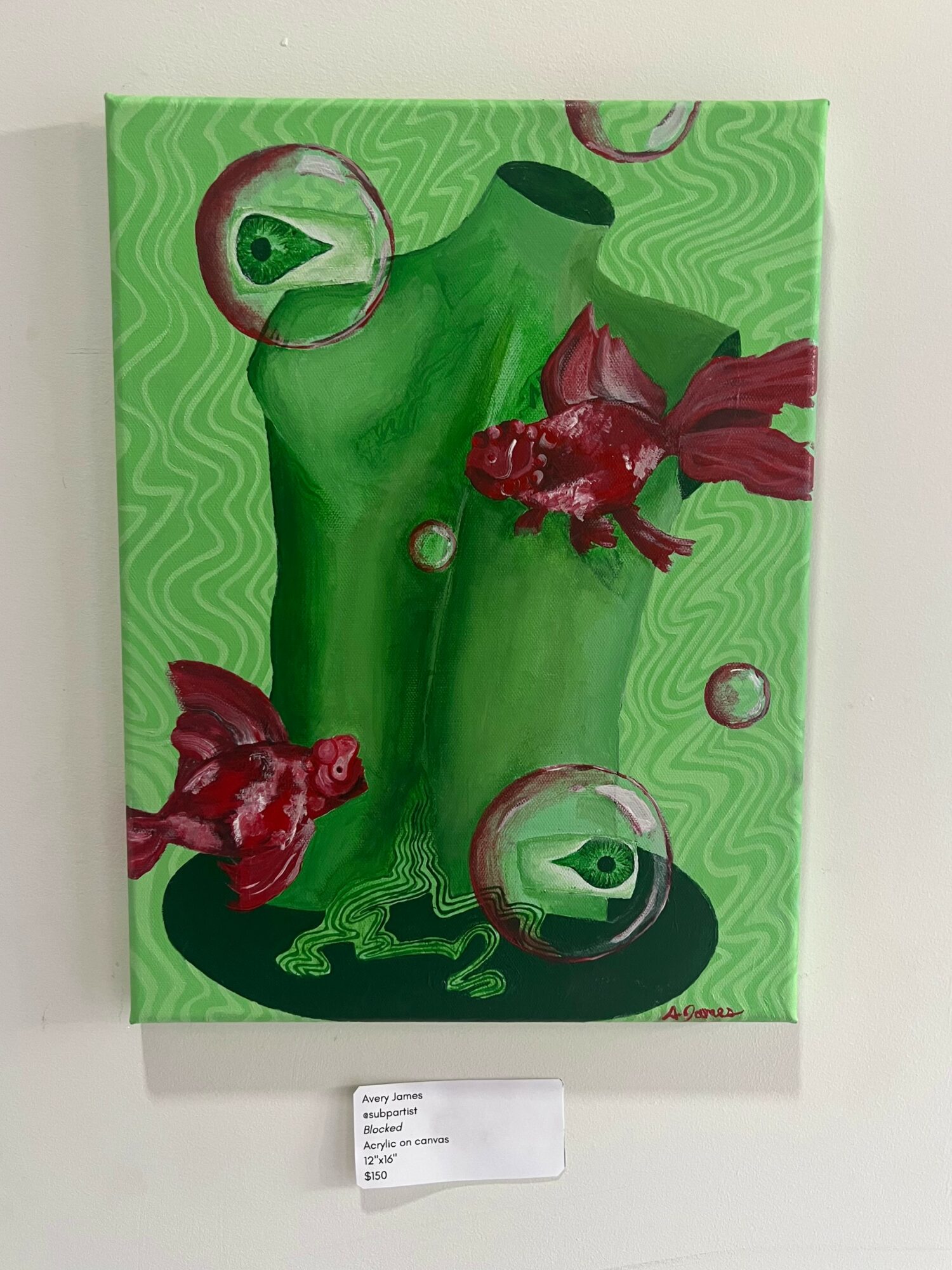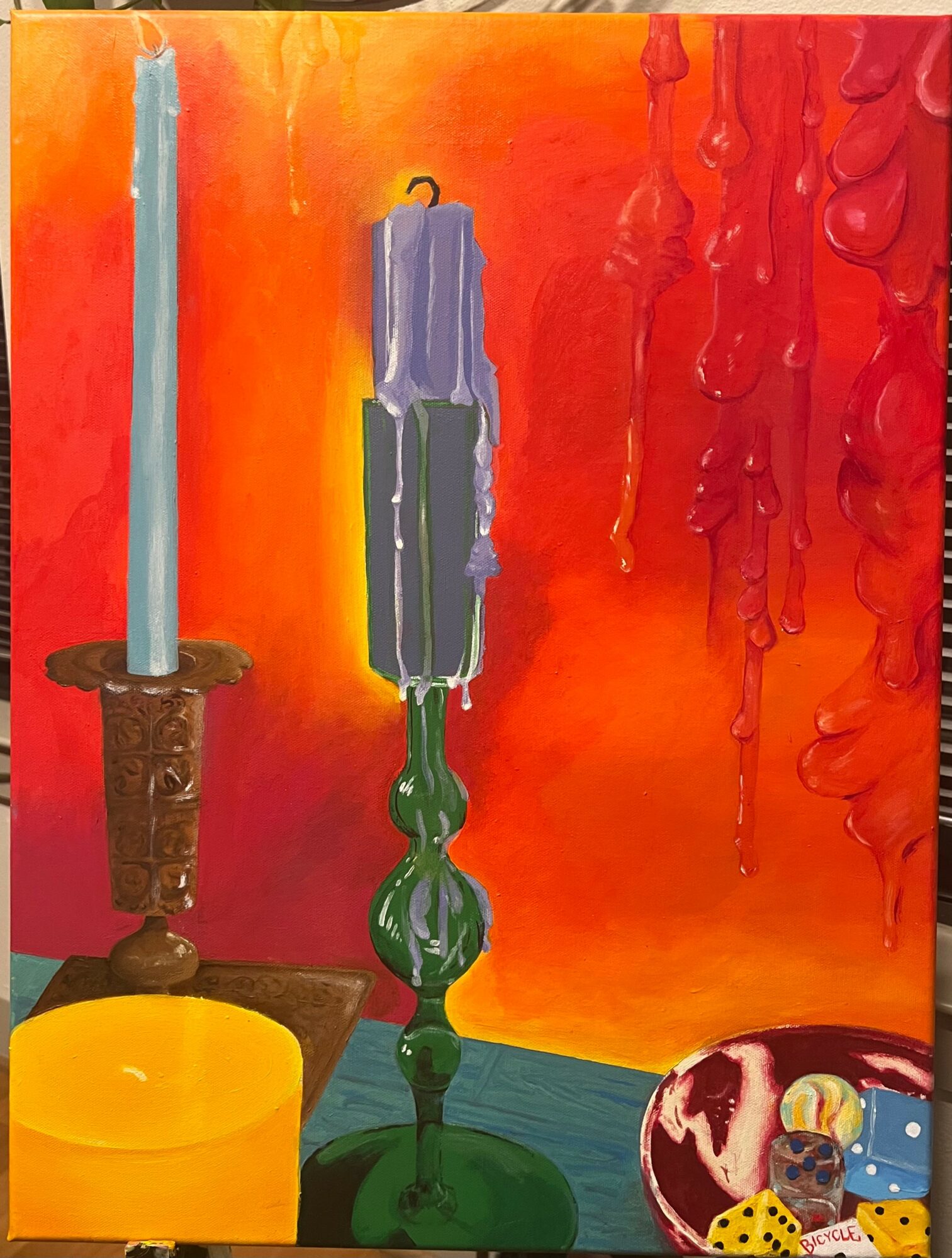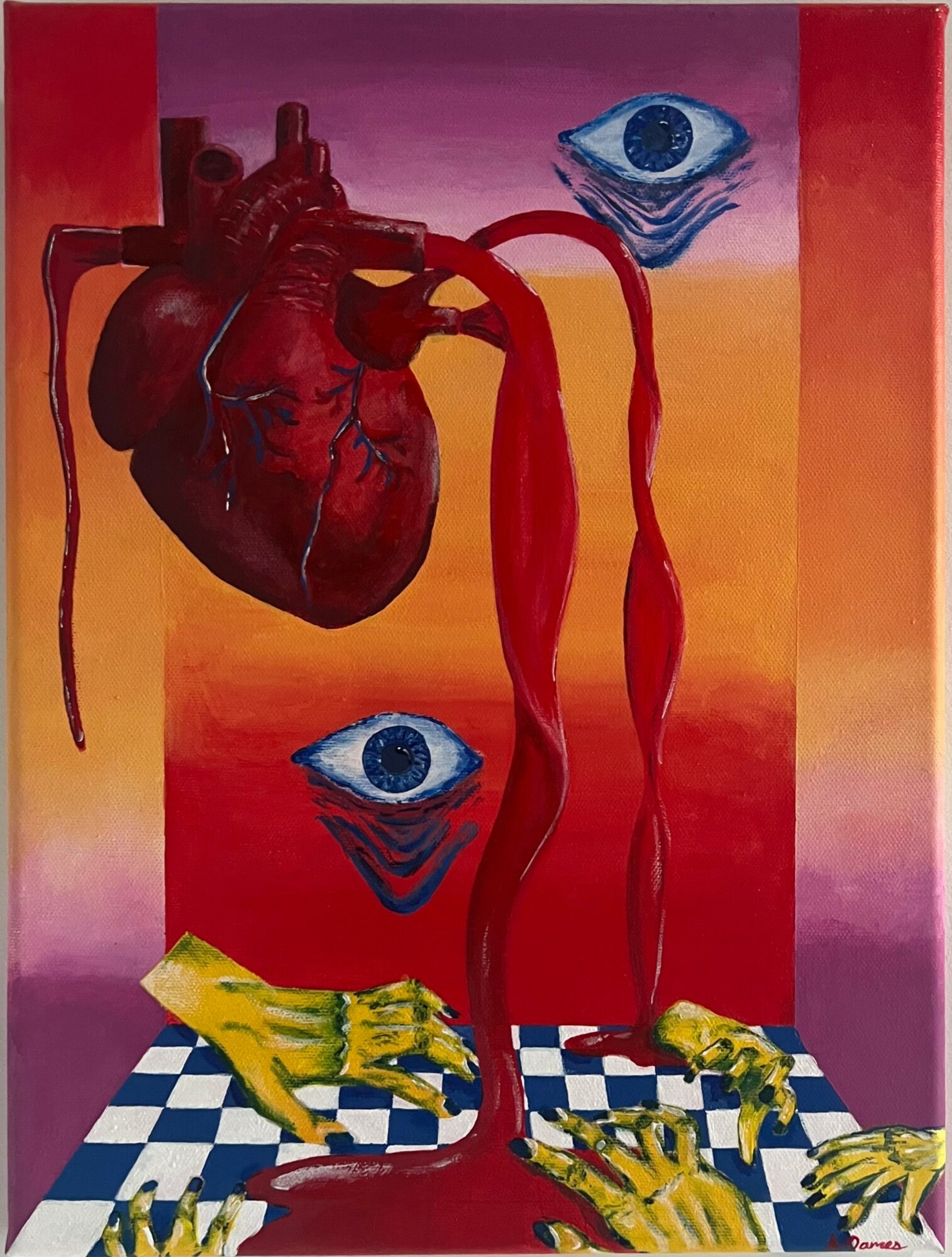 I primarily draw and paint. I use colored pencil, markers, and pens for my drawings. I primarily use oil and acrylic and love the use of complimentary colors. In my work, I explore my personal journeys with sexuality, gender, and mental health. I am most inspired by surrealism and try to incorporate this style in my work. I love exploring new forms of art so I also practice ceramics and screen printing when time allows. I sell handmade earrings and pet portraits on my website. The pet portraits have been the most popular item this year. My paintings can also be purchased through my website and I offer prints.