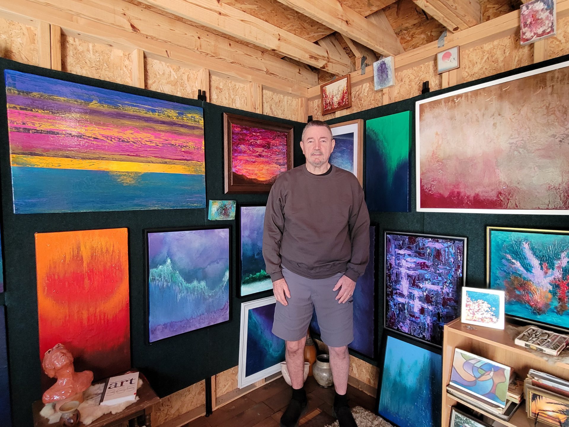Upon retirement, my spouse and I built a studio in our backyard, enabling me to continue exploring my artistic passions. I began exhibiting my work in local galleries and art businesses, where I discovered that many people were drawn to my style and subject matter. This positive reception motivated me to keep painting in ways that reflect both my personality and artistic sensibilities.