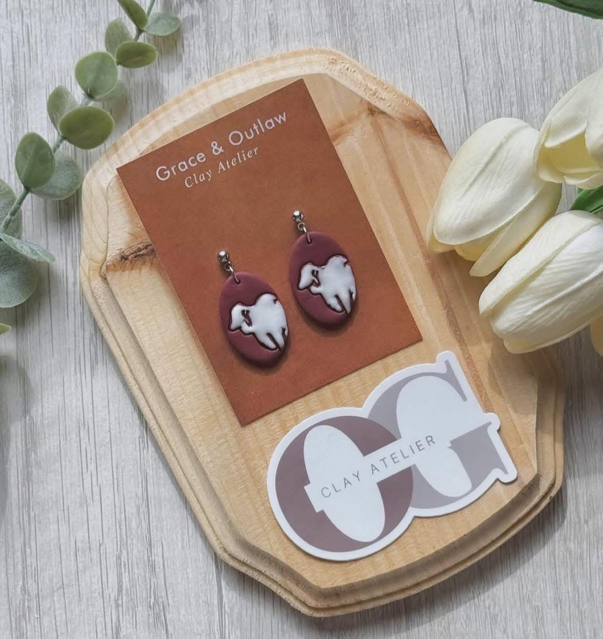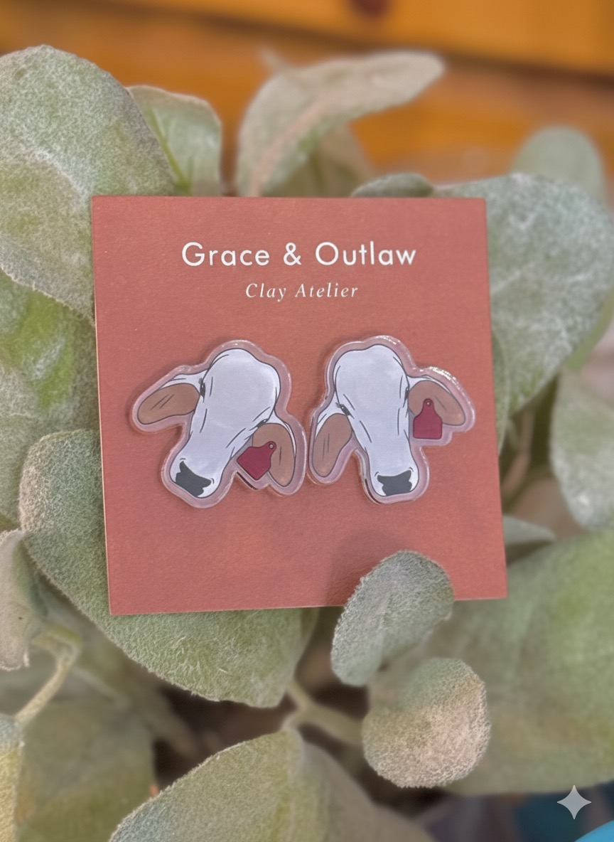 My business is Grace & Outlaw. The name I chose is to venerate my ancestors. Both of my parents that have passed. Both of them had their own unique set of skills and ambitions in life. My mother was very tech oriented, loved books, typed fast and that’s where my career comes into play. My father retired and was an outdoors man full time and he was always crafting always making things so i would say that I am an equal representation of both of them. Grace & Outlaw specializes in clay art polymer, air dry & cold porcelain. What I love the most is making Christmas ornaments when I’m not making jewelry I work on different ornament techniques all year round, which pays homage to the German side of my family. Christmas ornaments come from a tradition that started in 16th-century Germany. But we are most known for our Brahman cattle earring designs. My Stepfather was born & raised in Hungerford, Texas! If you know you know! Brahman Cattle have always been near and dear to my heart. Also marrying a ranch manager has made Brahman cattle even more special to me. What’s most important to my brand is the customer service aspect. Every private message, every email and social media comment is answered by me in a timely manner. I strive to ship orders out a fast as humanly possible. And I try to make my packages an experience. The way you receive my package is very important to me because I want my packaging presentation to emulate how much I love each piece I create. Some of the different services that I offer are custom branded cattle earrings & jewelry. I also make felt hat pins, keychains, ornaments & keepsakes