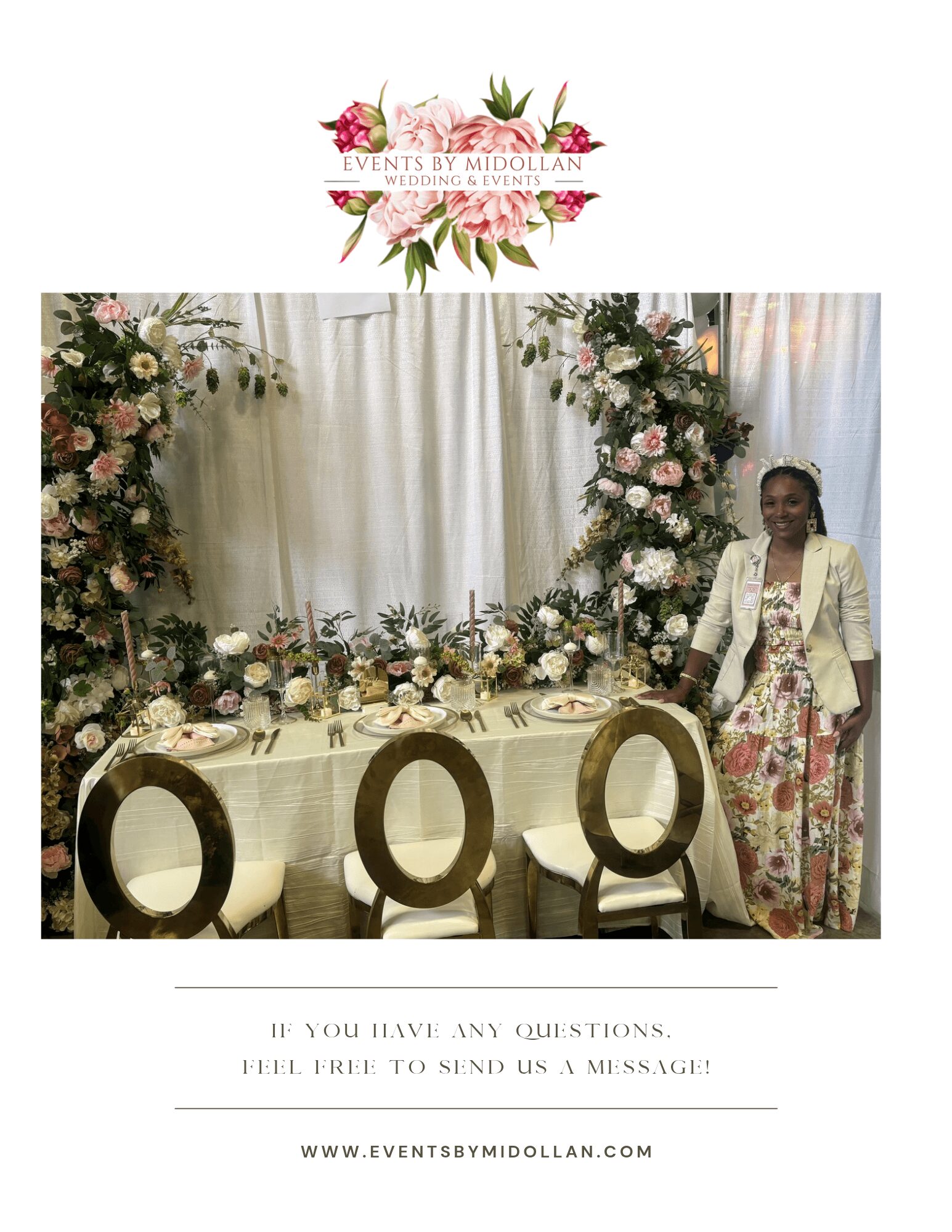 So I pivoted and opened a wedding planning and décor business. Today, Events by Midollan is dedicated to helping couples have fun and relieve their stress during this wonderful journey—from engagement to “I do” and beyond. We handle the details, so love can lead the way and every celebration feels beautifully effortless.