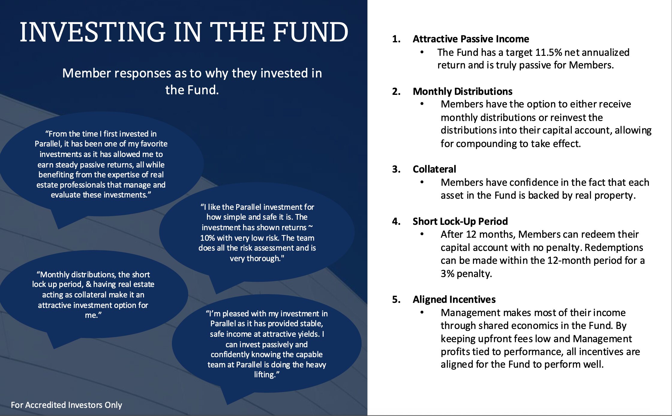 Ultimately, we’re known by our investors as guys that will do whatever it takes to preserve their capital. I think that’s what we take the most pride in. On the borrower side, we take a more qualitative approach to lending. We love to meet with our borrower face-to-face, and through the personal relationship we have with them, we know what is going on with the property, what may affect the status of the loan, and how we can be helpful. We chose Parallel as our name because we aim to run parallel to our borrower on their journey to financial freedom.