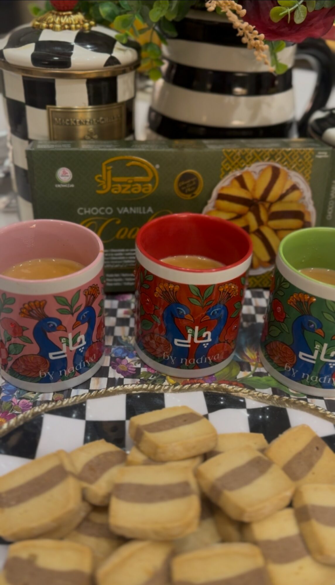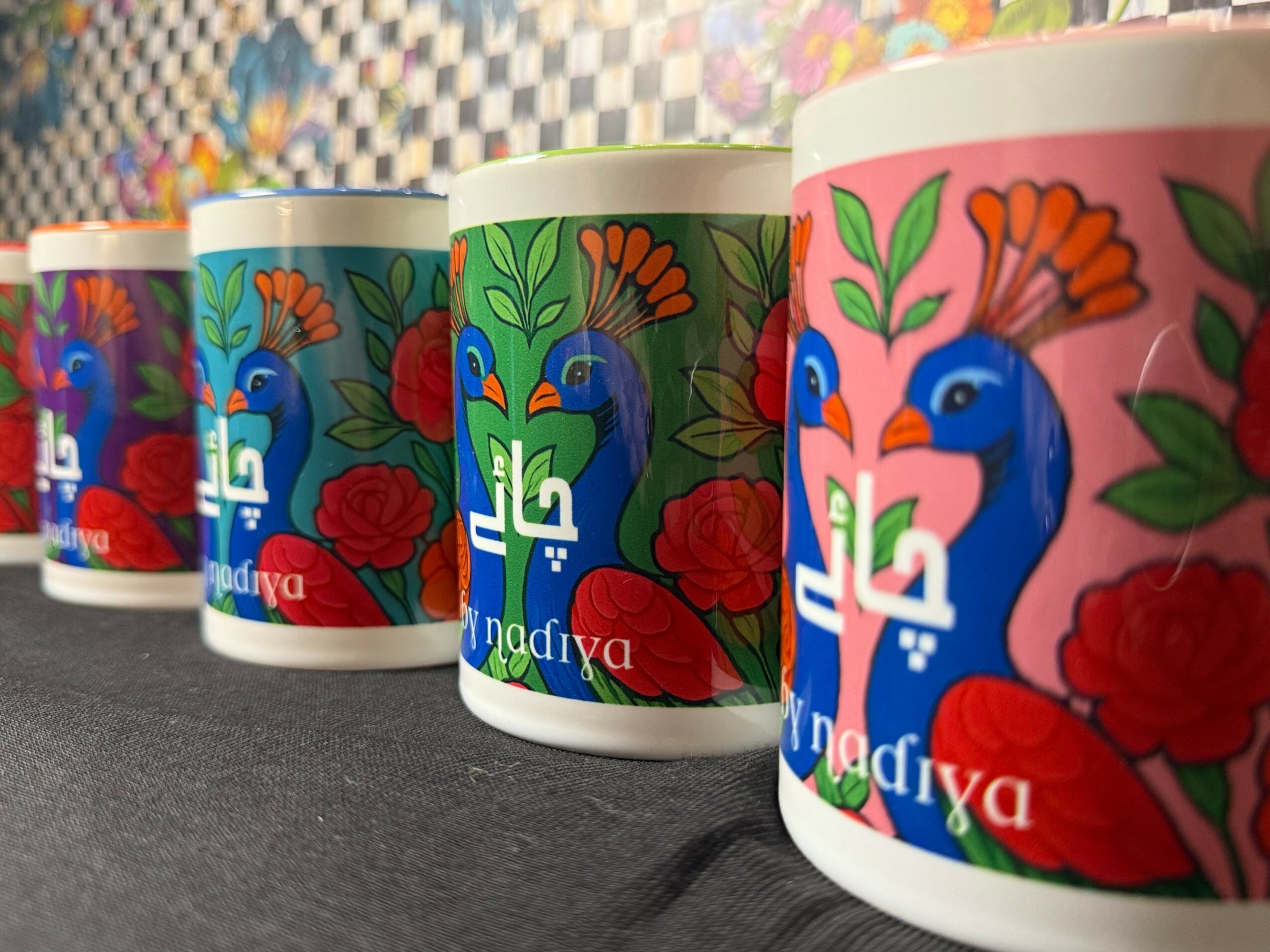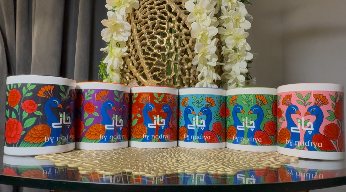 Beyond chai, I’ve recently launched the Peacock Muse Mug Collection, inspired by modern Pakistani truck art. It’s bold, expressive, and full of life. Available in six vibrant colors, each mug is designed to be the perfect size for a cup of chai. The collection blends color with elegance, turning everyday chai moments into something special. The Peacock Muse collection is now available on my website at www.bynadiya.com.