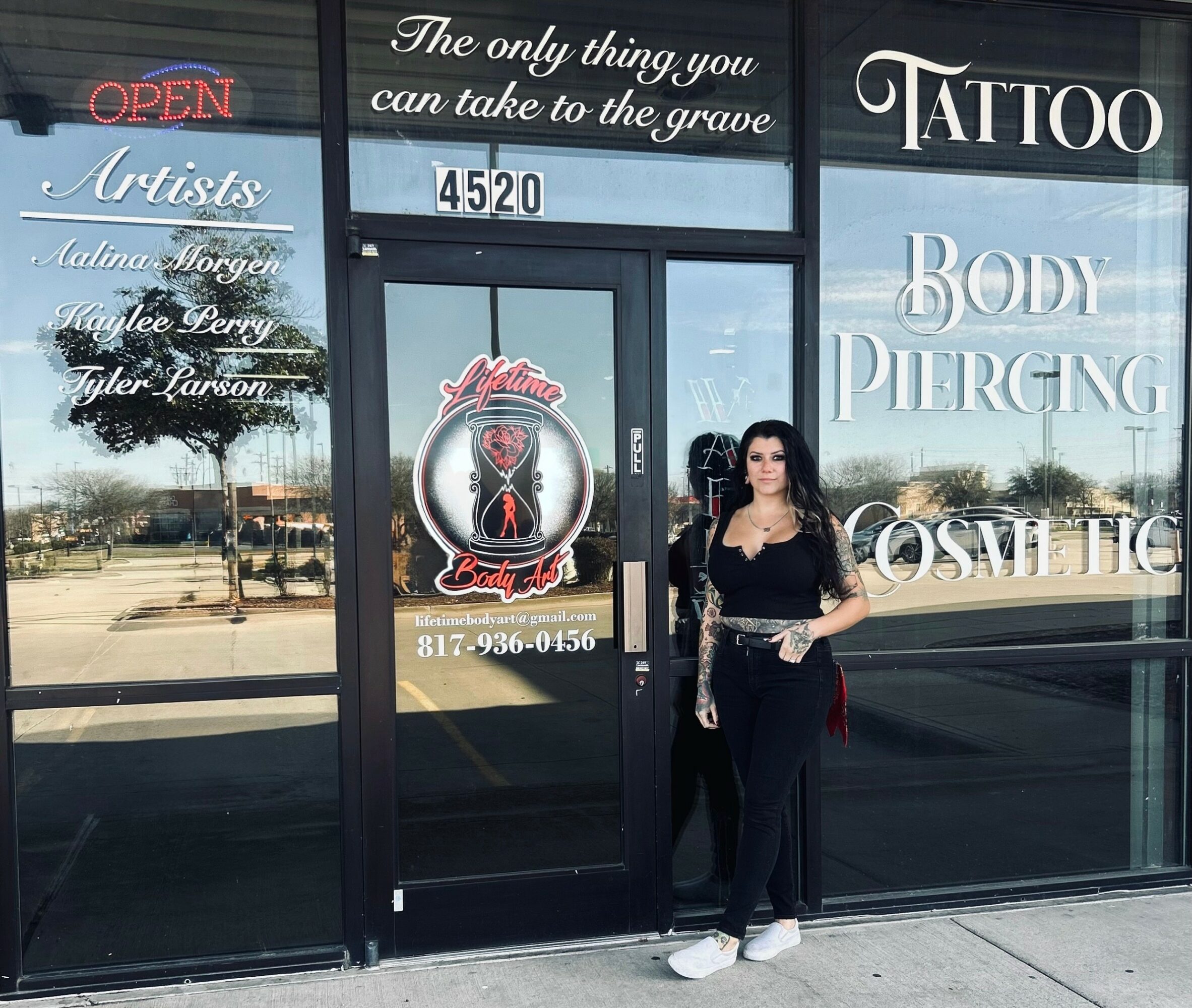 After I graduated high school I was in college, studying aviation and aerospace science and working on getting my pilots license in Colorado. When I moved back to Texas I was still working on getting flight time and working as a bartender and that’s when I met my fiancé AJ Brown, who owns Chop Shop Motorsports in Keller. He really pushed me to expand my knowledge and interest in art and tattooing. While it has always been something I have been interested in and dabbling with in school, he really supported me and pushed me to where I could make this small dream a huge reality. He helped me get an apprenticeship that I went through and learned so much from. I learned how to expand my skills and knowledge of tattooing into something that became my career and not just something I do on my free time. After I graduated my apprenticeship, AJ and I wanted to open a studio of our own which is every tattoo artists dream. We put in the time and work and opened up Lifetime Body Art in 2022 and have been rocking it since. We have an amazing team of artists that are just as driven as we are to make the shop a success and clean, fun, and amazing place to be tattooed in and work in. We are so blessed to have a supportive community and clientele that we all call family.