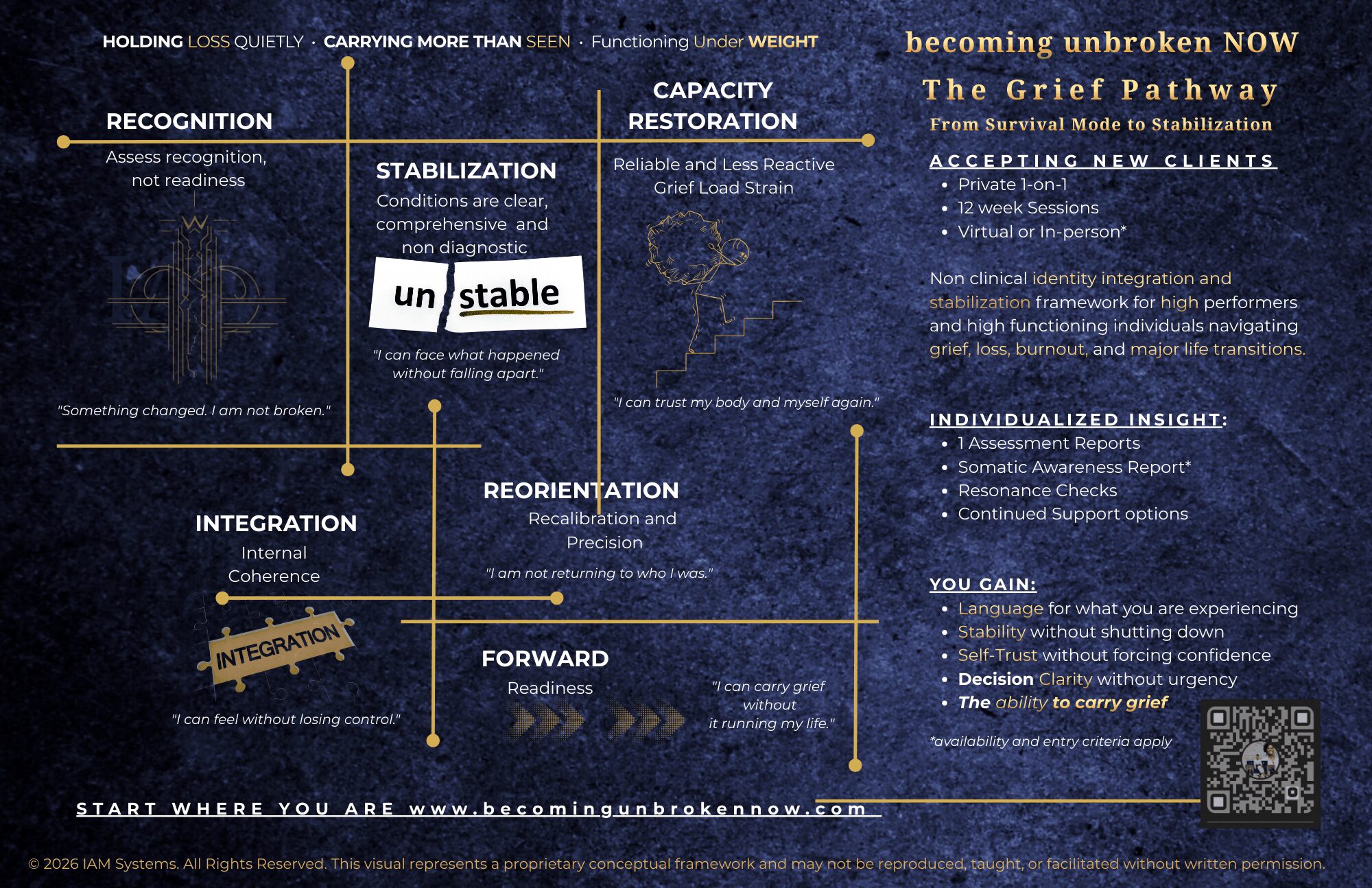 Our flagship offering is Becoming UNBROKEN NOW: The Grief Pathway, a twelve week guided orientation built around a person’s real internal experience, not assumptions or timelines.