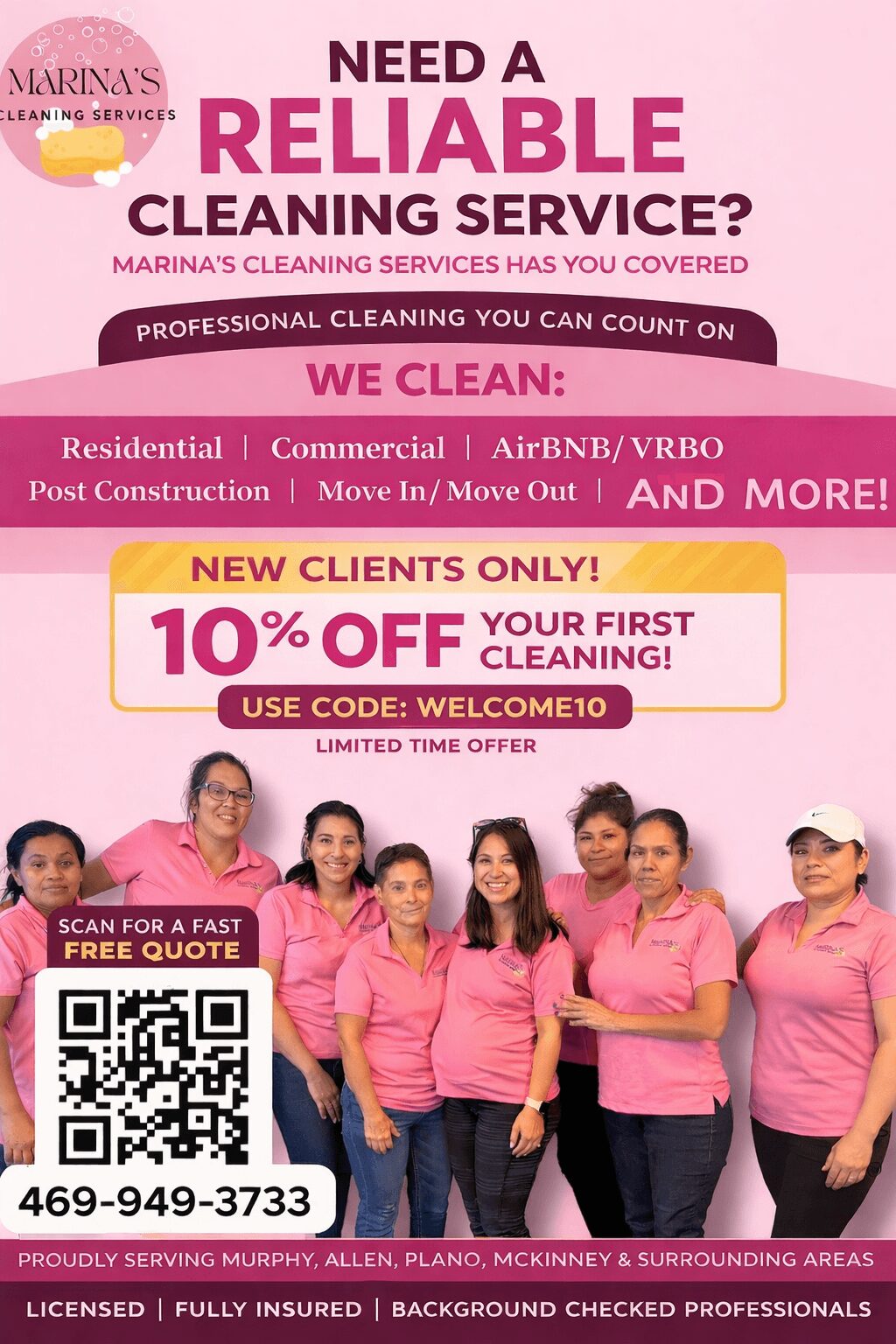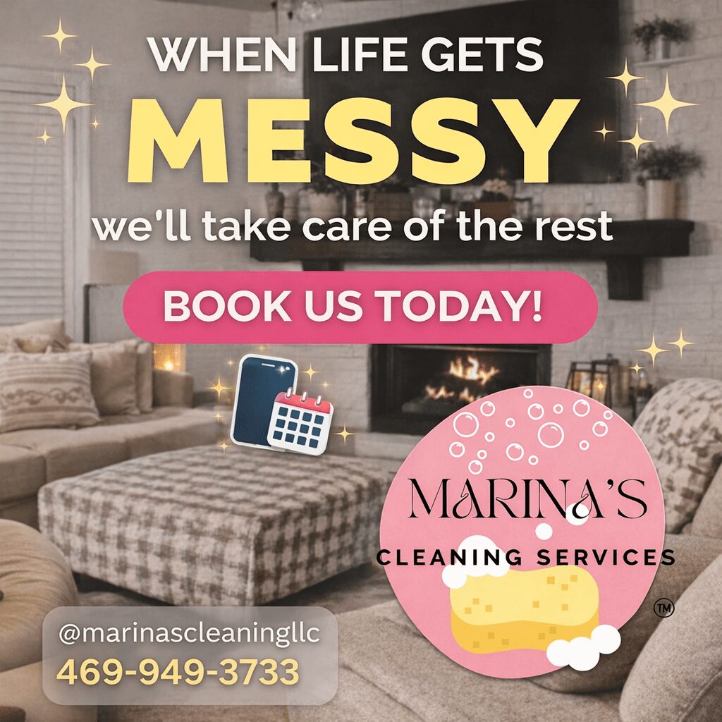 Marina’s Cleaning Services is a residential and commercial cleaning company based in Murphy, Texas. We proudly serve a radius of approximately 15 to 20 miles, covering areas such as Highland Park, Murphy, McKinney, Garland, Sachse, Wylie, Richardson, and Plano, extending toward the beginning of the Frisco area.