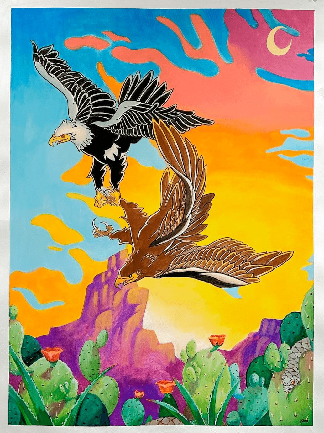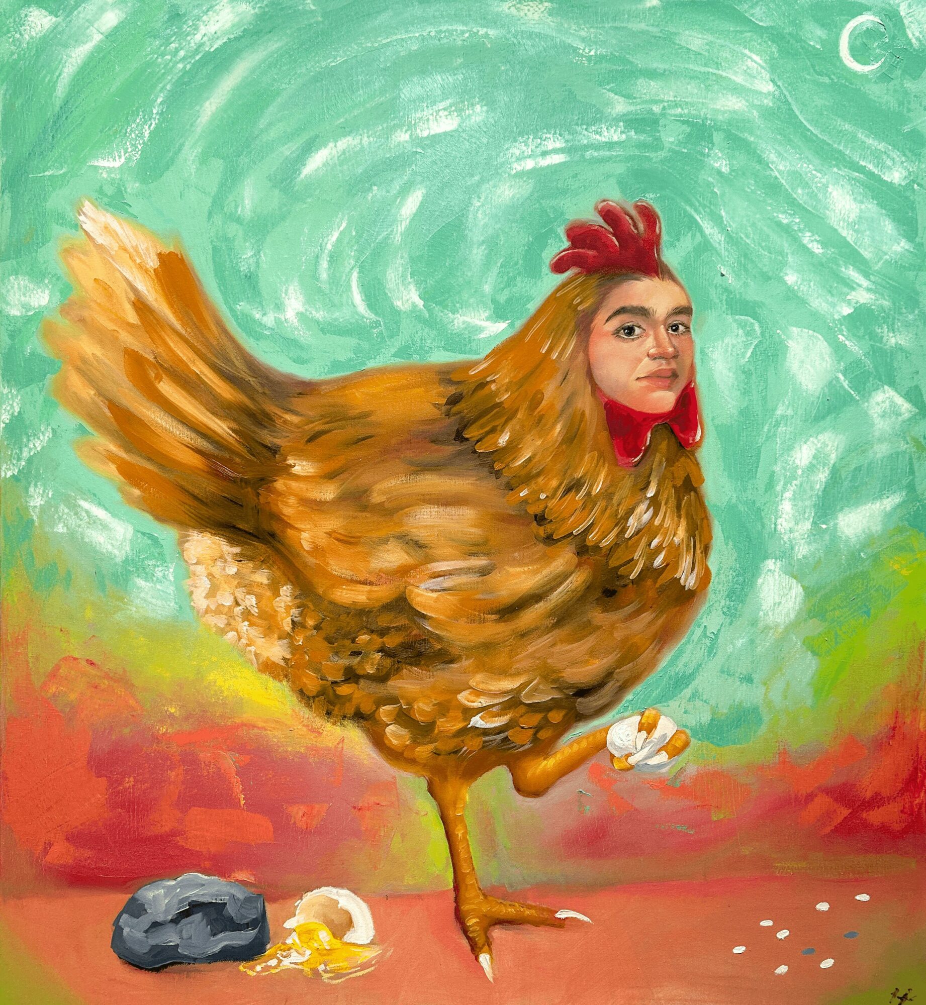Though I like working in different mediums like 3d sculpting, drawing, digital, or ceramics, my thing is painting, it’s where I feel most like myself. I like to think that that’s what I’m known for, maybe also for painting crazy lookin things with some colorful imagery, I’ve gotten a lot of comments and laughs at my chicken painting “my mother’s daughter”, which I completely understand.
