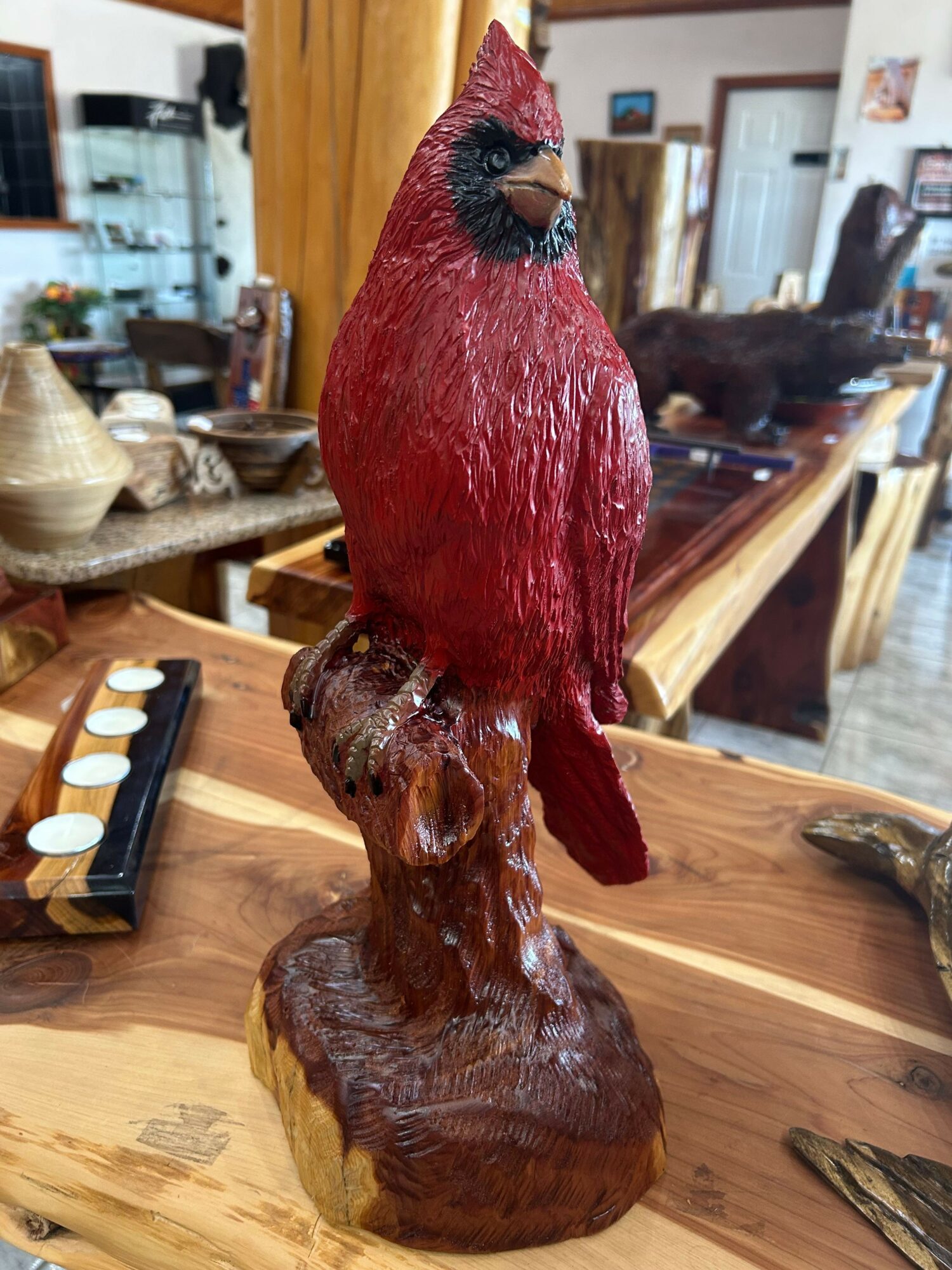 I started carving with the chainsaw in 1986 in Colorado with my ex husband, later in 1990 we moved to Texas and sold our art everywhere in Houston then Dallas. In 1996 we open the store Fine Wood Carvings on IH 35E near Waxahachie. After 2004 got a divorce and kept the business and decided to get more into the natural edge furniture along with the sculptures. I have had a wonderful time with my work and I feel really lucky to have the talent to do my work. I really enjoy it. Texas has been the place where i have grown with my art and I am grateful.