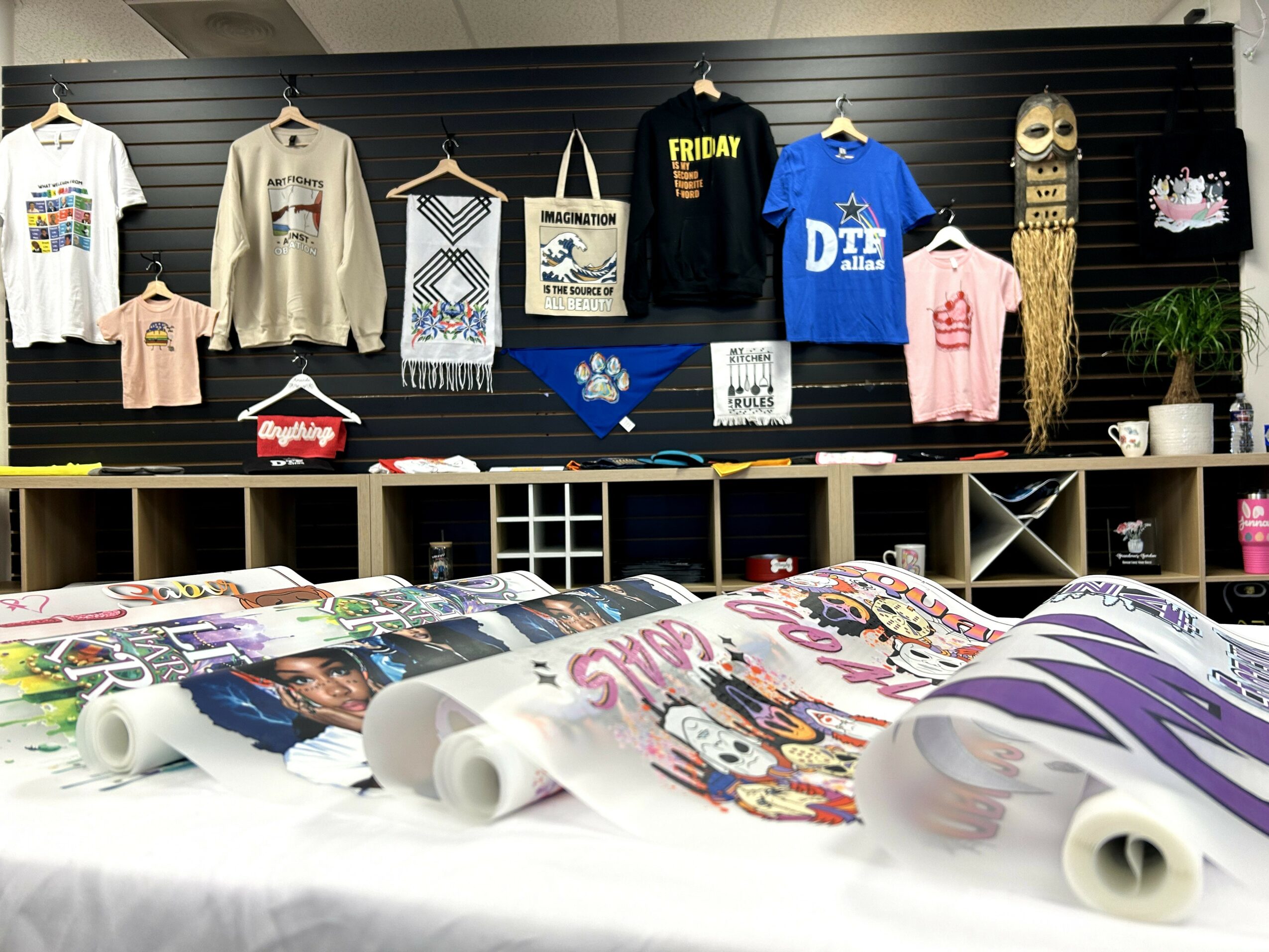 At DTF Dallas, we keep it simple: fast prints, no minimums, great quality, and real support. We offer same-day DTF transfers, welcome walk-ins, and even let you use our heat press room — for free.